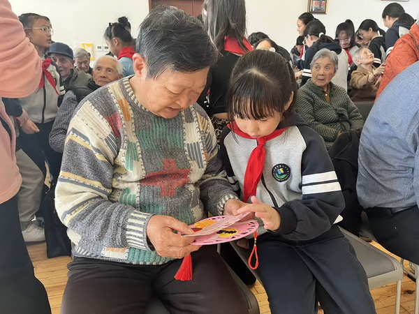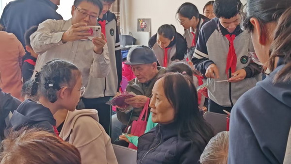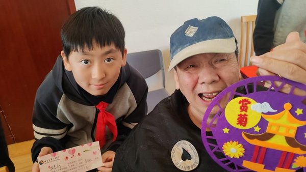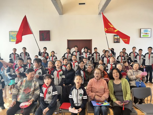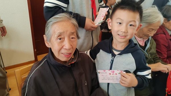 节目表演结束后,同学们将亲手制作的重阳节手工作品送到老人手中,小小的礼物承载着对长辈的真挚关爱。在温馨的氛围中,同学们与老人互签 “连心卡”,卡片上稚嫩的字迹与沧桑的笔触相映成趣,定格下两代人心灵相通的美好瞬间。活动最后,老少携手合唱《萱草花》,全体参会人员合影留念,将这份温暖与感动永久珍藏。