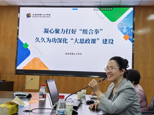 范晓琼副书记作“凝心聚力打好‘组合拳’,久久为功深化‘大思政课’建设”专题分享:分享聚焦新时代“大思政课”建设要求,详细介绍八十中构建的“三全”思政育人体系,重点从坚持“学段教育目标、内容和方法相贯通,思政课程与课程思政相融通,思政小课堂与社会大课堂相互通,线下与线上思想政治教育相联通”的课程设置“四通”原则出发,分享了“以9.3阅兵主题活动为例党建引领思政融入‘时光里的教育’、以模拟政协社团课程建设为例思政组主导从‘思政课程’走向‘课程思政’建设、以学习科学家精神为例德育处主导思政实践大平台”等“大思政课”鲜活案例,全面展现了学校以思政教育一体化抓手,助力师生“立鸿鹄志、做奋斗者”的育人成果。