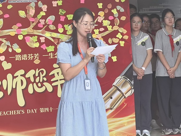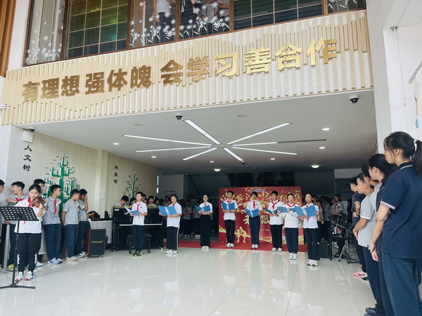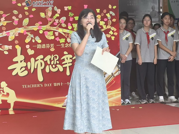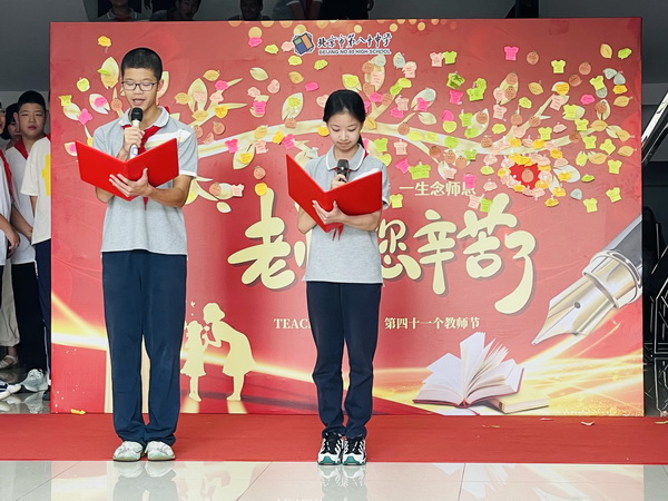 金风送爽,丹桂飘香。2025年9月10日中午,为弘扬尊师重教的优良传统,表达全体学生对老师的感恩之情,北京市第八十中学北校区隆重举行了“一路谱芬芳 ,一生念师恩”——第四十一个教师节庆祝活动。全体师生与教职员工齐聚中厅,以多样的形式向辛勤耕耘的老师们致以我们最崇高的敬意。