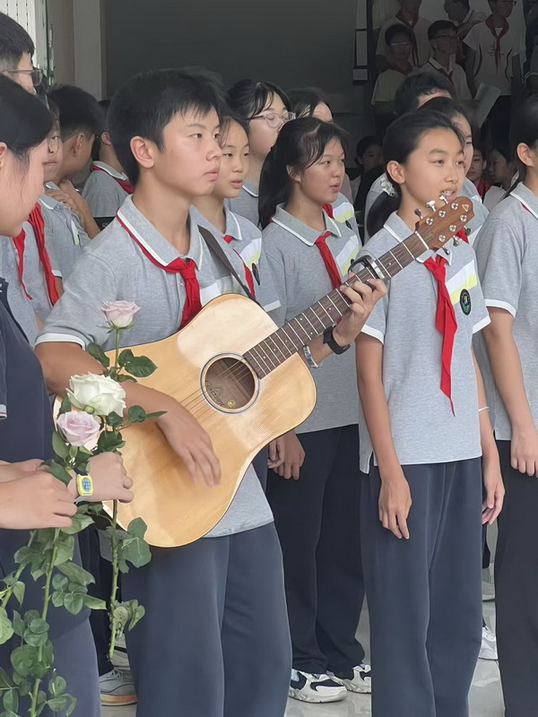 随后,初二年级的同学们带来了歌曲《稻香》。熟悉的旋律响起,瞬间将大家带回了记忆中那个纯真、美好的校园。同学们用清澈的歌声,表达了对老师们无私支持与默默守护的感激。正如他们所说,校园就像一个温暖的家,希望大家无论走多远,都能记得“回家”,回到最初的美好,回到老师的身旁。