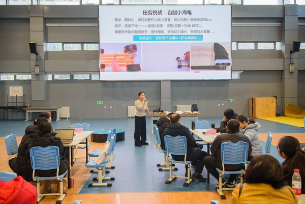 在“与知识关联专题工作坊——拆解小海龟”环节中,教师们热情参与实践项目。他们拆解玩具以探究其工作原理,并利用积木、齿轮、轴承等材料进行富有创意的组装,不断尝试并改进。这一过程与集团课程创新实验的目标不谋而合,旨在提升学生的创新实践能力,并强化“做中学”的教学理念。教师们不仅领悟了STEM教育的核心,他们的动手能力、创造力以及知识应用能力也得到了显著提升,为将来在科学学科教学中融入实践教学方法积累了宝贵经验。