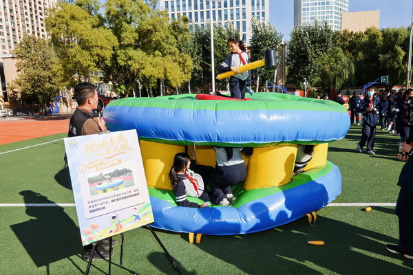 “悦动未来”板块设置了八个体育互动项目,同学们在运动中尽情释放活力,击退负面情绪:在“飞镖足球项目”中,同学们一脚射门,踢走烦恼;“打地鼠”项目,同学们齐心协力纠正不良习惯;“大力投篮”项目让同学们全力以赴,投出信心;通过“叠叠乐”项目,同学们锤走坏情绪,力争做青春的主宰者;“迷你高尔夫项目”使瞄准目标,规划路径;在“环游世界球项目”中,同学们用手牵引地图,模拟生涯旅程;“愤怒的小鸟项目”中,同学们通过发射“小鸟”,击碎愤怒;在“情绪九宫格”中,同学们通过投掷飞盘,告别不良情绪。