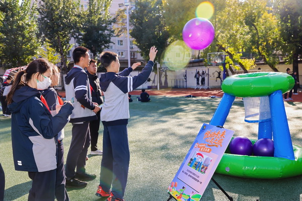 周一下午,阳光明媚,踏入运动嘉年华的现场,欢呼声与呐喊声瞬间将我包围。队友们默契配合,将小球成功倒入球口。