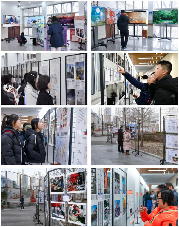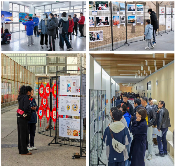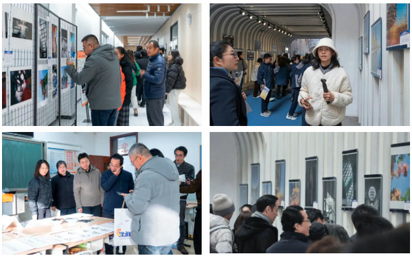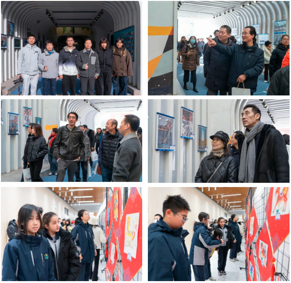 颁奖仪式结束后,全体师生移步户外合影留念,随后在引导员的带领下参观了数字艺术作品展。艺术长廊中,150幅摄影作品题材丰富、视角独特,既有对北京古建风貌的细腻捕捉,也有对现代都市生活的生动记录;教室与走廊的屏幕上循环播放20余部AI短片,内容涵盖校园生活、传统文化与科幻想象。这些短片显示出学生熟练的AI技术运用与丰富的想象力。60余项校庆主题文创设计与实物,巧妙融合传统元素与现代理念,呼应“古韵新生”主题。参观过程中,领导嘉宾和师生们不时驻足交流,对参展作品的艺术水准和创新精神给予充分肯定。