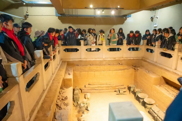 安阳殷墟,不仅是甲骨文的诞生地,更是中华文明的重要发源之地。在第三天的晨光里,我们在此沉浸式体验了殷墟标志性展演《再现·大邑商》,科技与历史的碰撞让静态的遗址“活”了起来,构建起跨越三千年的文明对话场景。我们前往殷墟唯一保存完整的商代王室墓葬——妇好墓,这座未被盗掘的墓葬出土的1928件文物,在地下展厅中构成了一幅鲜活的商代文明画卷。展厅内,“司母辛”铜方鼎的厚重纹饰、玉凤的灵动曲线、青铜钺的威严形制,无不彰显着墓主人的特殊身份。
