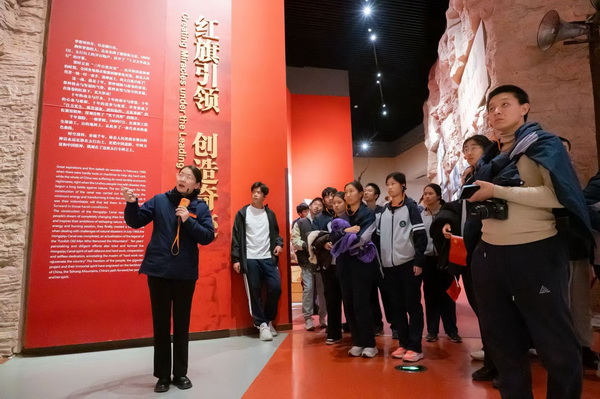 最后一天,我们前往红旗渠。在实训基地,同学们通过简易工具模拟修渠工序,亲身体验当年建设者面临的艰辛。徒步行走于青年洞的蜿蜒渠岸,触摸冰凉坚硬的石壁,“劈开太行山,漳河穿山来”的豪迈从课本走入现实。在红旗渠纪念馆,斑驳的工具与泛黄的照片,无声讲述着那段“自力更生、团结协作”的岁月。