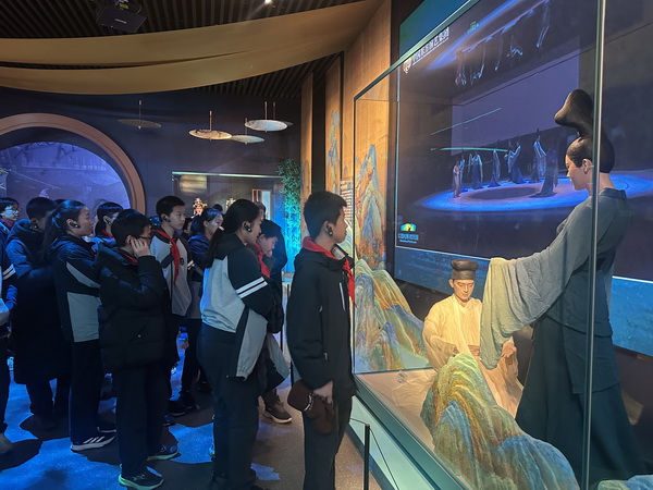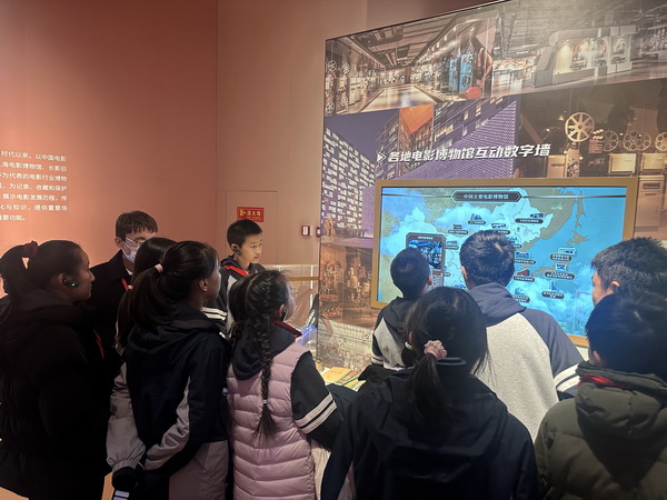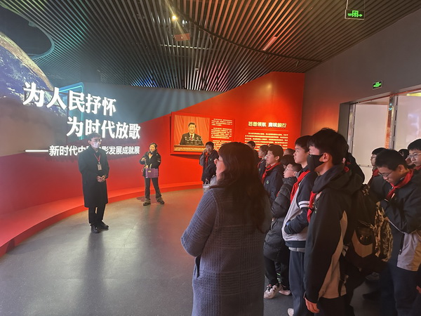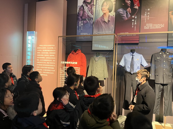 活动伊始,少先队员们身着整洁的校服,佩戴鲜艳的红领巾,怀着崇敬与好奇的心情有序进入中国电影博物馆。在博物馆讲解员的引导下,队员们参观了《为人民抒怀 为时代放歌——新时代中国电影发展成就展》板块,全面、深入、生动地记录了进入新时代中国电影从“电影大国”稳步迈向电影强国的辉煌历程和中国电影人以匠心耕耘时代、以光影书写历史的感人故事,该展览也是中国电影博物馆在原有基本陈列《百年历程 世纪辉煌——中国电影1905-2005》的延续,完整地呈现了中国电影120周年的发展历程。 该展览从“电影创作繁荣发展、电影产业提质升级、电影科技日新月异、公共服务惠及民生、光影出海交流互鉴”五个章节,聚焦新时代中国电影发展成就。展区展示空间近2030平米,展线长度460延米,涉及影片170余部,展藏品300余件,多媒体视频361分钟。展览藏品数量与质量并重,陈凯歌导演在《志愿军》系列电影中的文字分镜头手稿,张艺谋导演签名的《狙击手》剧本,《红海行动》原型、也门撤侨行动中海军547军舰悬挂的军旗和总指挥官夏平将军下达作战命令计时用的手表,《第二十条》中韩明在法庭上穿着的检察官制服,《我本是高山》中张桂梅的服装《我们一起摇太阳》中凌敏和吕途的服饰,《热辣滚烫》中杜乐莹使用的拳击服和拳击手套、《长安三万里》《深海》《大圣归来》《大鱼海棠》等动画电影的美术设计稿等新时代电影藏品都是首次与广大观众见面。一件件承载历史的拍摄道具、一段段经典的电影片段,让队员们全方位了解了中国电影在不同历史时期与国家命运同频共振的发展历程,更深刻感受到了电影艺术中蕴含的民族精神与时代力量。