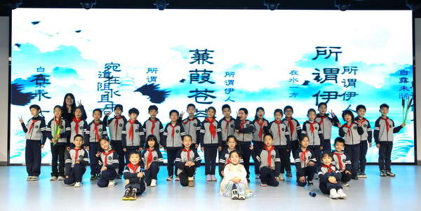 二年级一班的同学们率先登场,以真挚的吟诵演绎《蒹葭》。孩子们的嗓音清亮悠远,将“溯洄从之,道阻且长”的缥缈追寻展现得淋漓尽致,让在场观众仿佛置身于朦胧的意境中,赢得阵阵掌声。
