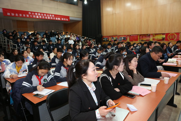 本次观摩实现了集团内线上观摩的广泛覆盖。在望京校区会场,来自八十中教育集团望京、南、北、东四个核心校区,以及嘉源分校、温榆河分校、望京实验学校、陈经纶分校等成员校的102名师生代表齐聚一堂。这支队伍构成多元,涵盖了校模拟政协社团成员、小初高各学段学生、内高班藏族学生,以及教师党员、学生团员和来自集团思政大学科部的青年教师。他们与朝阳区观摩领队、区教委基教二科副科长石岩老师共同参与了集体线上观摩。与此同时,区内18所成员校与远在河北的雄安分校师生也坚持同步线上观摩,确保每一次学习都能跨越空间的阻隔,实现思想的同频共振。