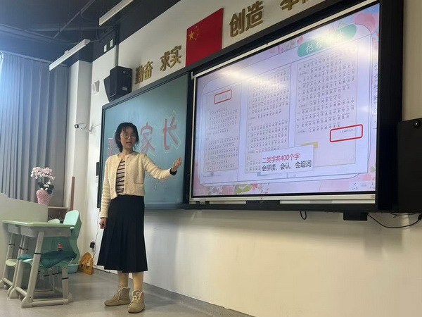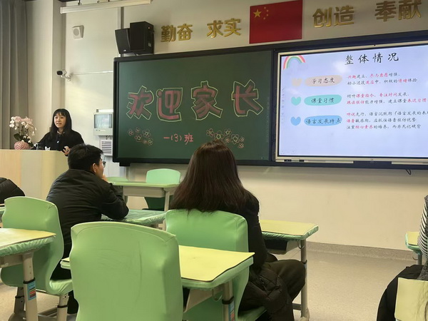 英语周老师和王老师,结合上学期各班的英语学习情况和本学期的教学目标,向家长们分享英语学习建议。充分肯定同学们在学习习惯和课堂参与度方面取得的进步,细致讲解了一年级下学期的学习内容与重点,推荐了经典绘本,鼓励孩子们养成良好的课外阅读习惯并开拓视野。