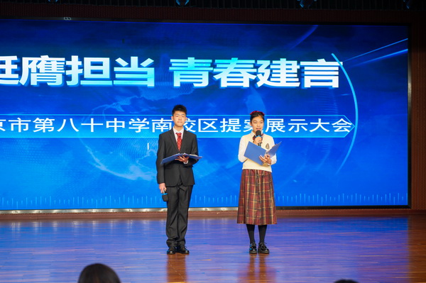 为鼓励同学们主动参与校园与社会建设,发出青春强音、贡献少年力量,近日,北京市第八十中学南校区“挺膺担当,青春建言”校园提案展示活动在地下礼堂顺利落幕。本次活动由学校德育处、年级组与道德与法治教研组联合主办,于2026年3月10日正式举行,经过层层筛选,初一、初二年级共有20份优秀提案脱颖而出,进入现场展示环节。