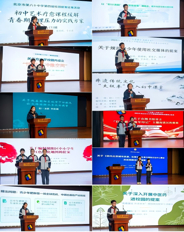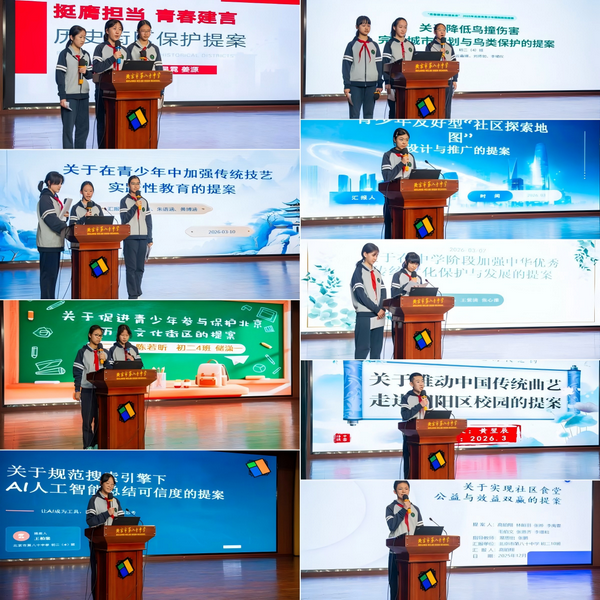 青春有态度,建言有力量。这些充满温度与智慧的提案,将成为建设美好校园、助力社会发展的宝贵力量,更将“天下兴亡,匹夫有责”的信念深深扎根在学子心中。未来,北京市第八十中学将继续秉持“勤奋、求实、创造、奉献”的校训,坚守“一人一天地,一木一自然——让生命因教育而精彩”的办学理念,持续搭建平台,鼓励学子们主动发声、积极建言,让青春在担当与奉献中绽放光彩,携手书写学校与少年成长的美好明天。